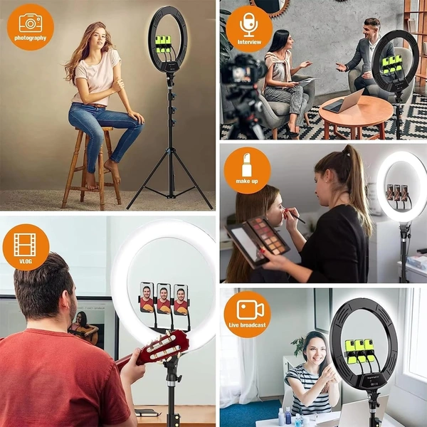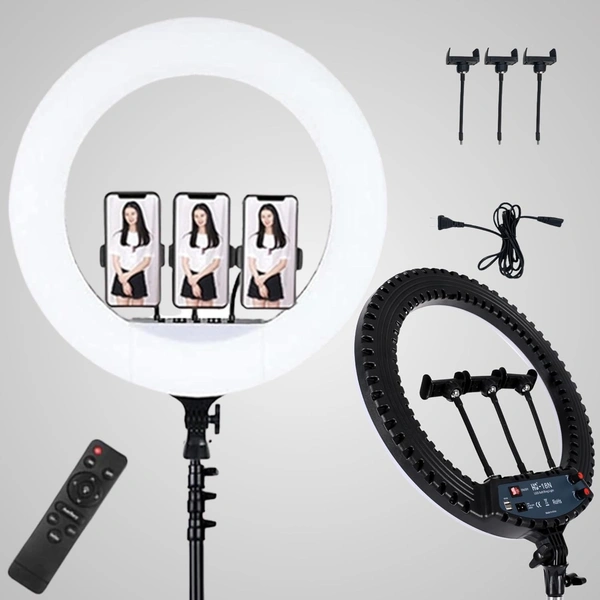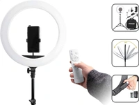 MirgIndia 18-inch (56 Cm) Big LED Ring Light with 2 Color Modes USB-Powered, with Remote Control, for Video Shoot Adjustable Brightness. About this item :- 💡 ADZOY 18-Inch Large Ring Light – Delivers bright, uniform, and shadow-free lighting for professional use. Provides bright, even, and shadow-free lighting for videos, photography, and makeup. 🎮 Bluetooth Remote Control – Wireless shutter remote for photos and videos at your fingertips. Capture photos and control video recording hands-free from a distance. 🌈 3 Color Modes + Dimmable Brightness – Choose from Warm, Neutral, and Cool tones with 10 brightness levels. Switch between Warm, Neutral, and Cool White tones to suit any environment. 🔌 USB or Adapter Powered – Compatible with power banks, USB ports, and standard chargers. Compatible with USB ports, wall adapters, or power banks for versatile use. 📱 360° Rotating Phone Holder – Supports most smartphones for vertical and horizontal shooting. Universal holder fits most smartphones; perfect for portrait and landscape shots. VERSATILE LIGHTING: 10-inch LED ring light with 3 colour modes (warm, cool, and natural white) for perfect illumination in any setting ADJUSTABLE BRIGHTNESS: Stepless dimming control allows precise adjustment of light intensity to achieve desired lighting effects CONVENIENT CONTROL: USB-powered design with included remote controller for easy operation and settings adjustment MOUNTING SYSTEM: Features a ball head mount for flexible angle adjustment and secure positioning COMPACT DESIGN: 25.4 cm diameter ring light is perfectly sized for desktop use and portable enough for various applications Thanks for connecting (Mirgindia) Thanks so much. Shopping with Mirgindia karolbagh Delhi. Note - China के मॉल में किसी भी प्रकार की कोई गारंटी / वारंटी नहीं होती ( चले तो चांद तक ना चले तो शाम तक ) Only Wholesale | Good Quality Product & Long Life Sorry For in our Policy 🙏 | No Guarantee | No Warranty | No Return | No Refund | No Exchange 💱 | ।। धन्यवाद ।।