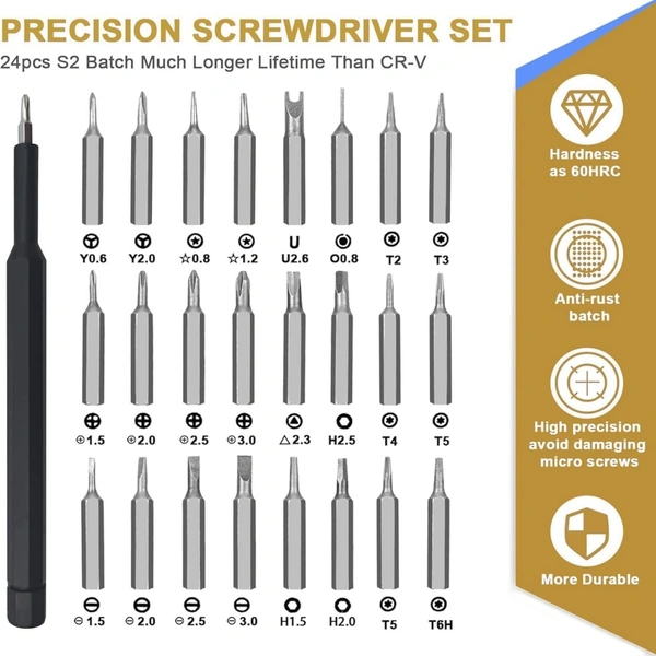 MirgIndia 24 in 1 Mini Screwdriver Set with Case, Small Flathead Magnetic Screwdriver Kit for Electronics, PC, Watches, Glasses, Phones, Jewelry About this item :- High Quality Interchangeable Precise Manual Screwdriver Set Is Made Of S2 Tool Steel, Not Easy To Oxidize Or Rust. Anti-Sweat And Anti-Corrosion, Wear Resistant, Heat Resistant, Tough, Hard And Durable. All Standard Size Bits Have Passed Strict Quality Control Tests, The Tip Is Stable And Not Easy To Fall Off, Which Can Be Continuously Operated By One Hand. Spectacle & Laptop Screwdriver Companion: Tackle spectacles and laptop repairs with confidence. Each bit is crafted from durable, high-grade materials to prevent wear and tear, ensuring longevity and reliability for frequent use. Watch Screwdriver Tool Set: Tailored for watch repair and electronic device maintenance, this set ensures accuracy and care for delicate components. The anti-slip handle and magnetic bits provide enhanced control and precision. 24-in-1 Precision Screwdriver Set: This all-in-one set includes 24 interchangeable bits, perfect for handling delicate repairs on watches, spectacles, laptops, and more. Achieve precision and efficiency with every turn! True All-Rounder The Precision Screwdriver Set Has 24 Mini Screw Bits, Which The Shape Is Marked Inside The Case, And The Corresponding Model Is Engraved On The Bits. Easy To Find The Tool You Need Quickly. Suit For Tablet, Watch, Camera, Glasses, Computer, Mobile Phone, Laptop, Keyboard, Ps4, Headphone, Drone, Game Console And Other Electronic Repair And Care. Electric Mini Screwdriver Kit: Experience effortless operation with our electric-powered screwdriver, designed to deliver optimal torque for delicate projects. The mini size is ideal for compact storage and easy handling, especially when working with small screws. Compact and Portable Design: This 24-piece precision screwdriver set is housed in a convenient storage case, making it perfect for on-the-go repairs. Whether at home or on the move, you’ll always have the right tool at your fingertips. *Thanks for connecting (Mirgindia)* Thanks so much. Shopping with Mirgindia karolbagh Delhi. *Note - China के मॉल में किसी भी प्रकार की कोई गारंटी / वारंटी नहीं होती ( चले तो चांद तक ना चले तो शाम तक )* *Only Wholesale* *Good Quality Product & Long Life* *Sorry For in our Policy 🙏 | No Guarantee | No Warranty | No Return | No Refund | No Exchange 💱 |* *।। धन्यवाद ।।*
