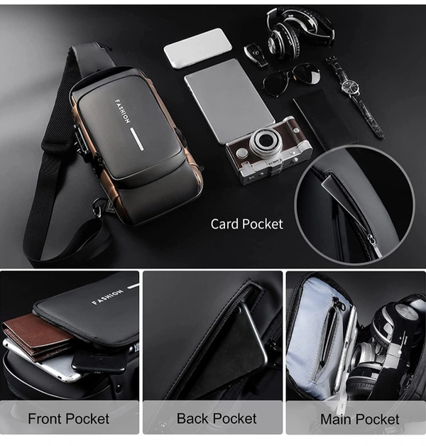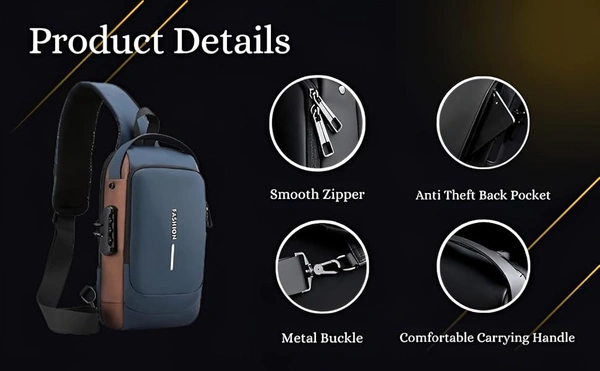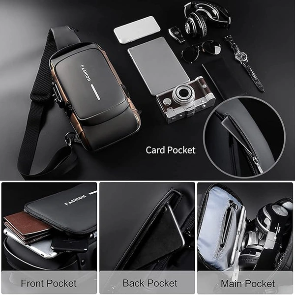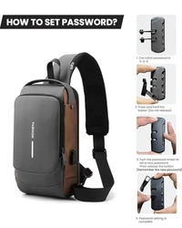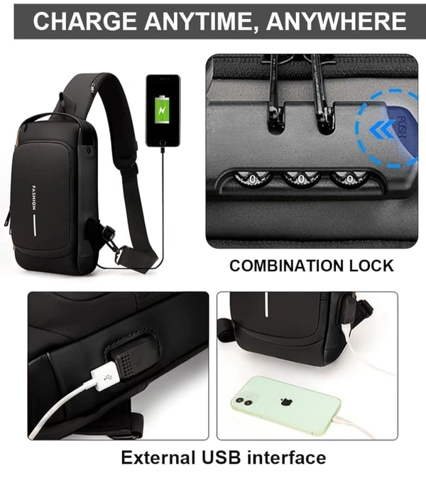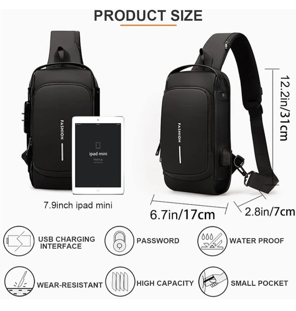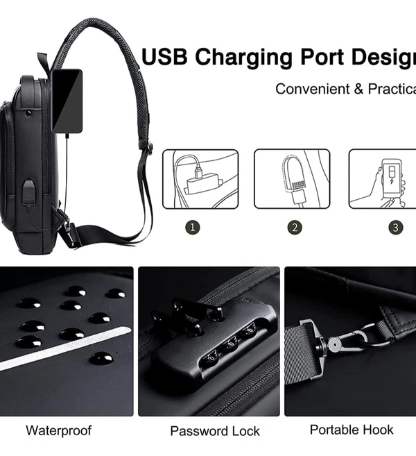 MirgIndia Waterproof Polyester Slim Unisex Crossbody Sling Bag Chest Backpack Men's Shoulder Bag, Leisure Travel Handbag, Hard Shell Anti-Theft Chest Bag, About this item MATERIAL: This crossbody chest bag is made of faux leather material. Durable metal zippers close and open smoothly, ensure a secure and long-lasting usage everyday or weekend. MULTI STORAGE POCKETS: This crossbody chest bag has front small pocket is convenient for various small items like mobile phone, keys, cards etc. Large compartment with inner small pockets is great for power bank, water bottle, wallet, small diary. Exclusive pocket on the shoulder strap make this chest bag thoughtful. FUNCTIONAL & SAFE: Its durable code lock design, which can protect your personal things perfectly when you go outside. Hidden USB charging port make your phone easy to charge when you at outdoors and travel It provide a hidden pocket at the back can protect your wallet and valuables from stolen. PASSWORD SETTING METHOD: 1. The default password combination is: 0-0-0. When unlocked, push the zipper pullers into the lock. Spin the dials to a random combination to lock it. 2. To unlock, spin dials to the correct combination and press the button to release the zipper pullers. 3. To change the password combination, ensure that it is unlocked, then press the button down. Without releasing the button, spin the dials to the combination you want. Once this is done, release the button. You have set a new password combination for your lock. MULTIPURPOSE USE: This stylish travel sling bag can be used as a chest or shoulder bag, making it ideal for adults. It's perfect for outdoor cycling, day trips, hikes, travel, and camping, allowing you to keep your hands free while enjoying activities like hiking, camping, climbing, running, and cycling. PACKAGE INCLUDE: 1 x Crossbody Chest Bag, 1 x Cable :::: Color: Black :::: Size: 17L x 9W x 31.5H cm :::: Material: Faux Leather. *Thanks for connecting (Mirgindia)* Thanks so much. Shopping with Mirgindia karolbagh Delhi. *Note - China के मॉल में किसी भी प्रकार की कोई गारंटी / वारंटी नहीं होती ( चले तो चांद तक ना चले तो शाम तक )* *Only Wholesale* *Good Quality Product & Long Life* *Sorry For in our Policy 🙏 | No Guarantee | No Warranty | No Return | No Refund | No Exchange 💱 |* *।। धन्यवाद ।।*