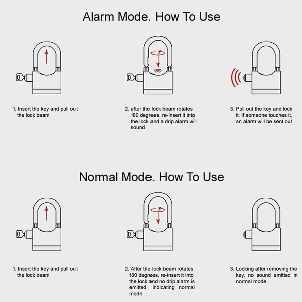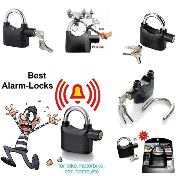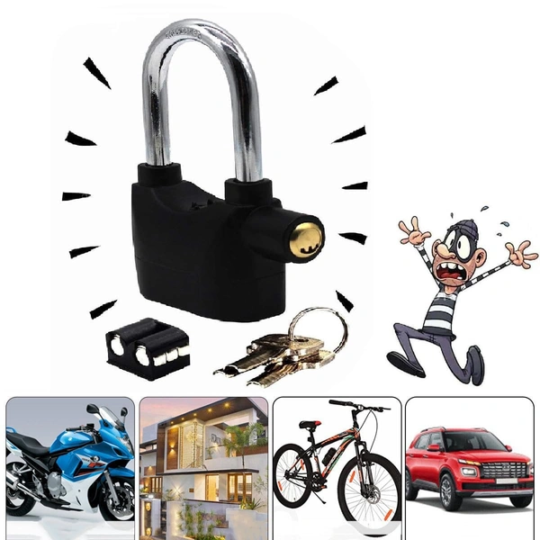 MirgIndia Door Alarm Pad Lock for Home Safety, Bike, Bicycle | Waterproof Anti Theft Motion Sensor Siren 110DBA Security Lock for Universal Use | Thickened Shackle Lock with 3 Keys (1, Multi) About this item :- Padlock that will alarm: This black padlock Combine the lock function with the alarm function to achieve a comprehensive anti-theft, so that you can be more assured, it will protect your wealth from loss. 110D Super Sound Burglar Lock: This alarm lock has a built-in siren that triggers an alarm that emits up to 110 decibels of loud sound when locked or shaken, making it ideal for avoiding theft. How To USE : 1. Insert the key and pull out the lock beam. 2. after the lock beam rotates 180 degrees, re-insert it into the lock and a drip alarm will sound. 3. Pull out the key and lock it. If someone touches it, an alarm will be sent out. Rugged Waterproof Padlock Rugged Lock is made of high-quality aluminum alloy, it is corrosion-resistant and waterproof. It has a longer service life than other locks. It is a economical choice for you. Wide application: Padlock with multiple uses has Mini appearance, easy to carry, with 2 keys, suitable for most motorcycles, bicycles, containers, doors, sliding doors, windows, etc. Included Components: 1 X Alarm Lock, 3 X Keys. *Thanks for connecting (Mirgindia)* Thanks so much Shopping with Mirgindia karolbagh Delhi. *Note - China के मॉल में किसी भी प्रकार की कोई गारंटी / वारंटी नहीं होती ( चले तो चांद तक ना चले तो शाम तक )* *Only Wholesale | Good Quality Product & long Life* *Sorry For in our Policy 🙏 | No Guarantee | No Warranty | No Return | No Refund | No Exchange 💱 |* *।। धन्यवाद ।।*