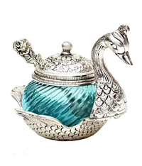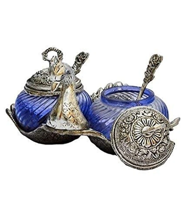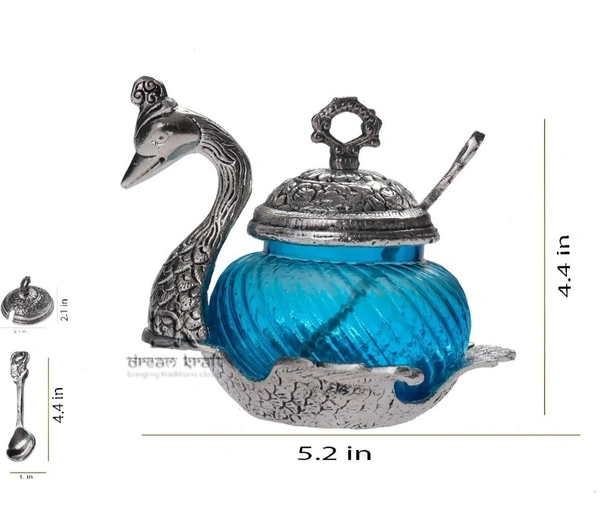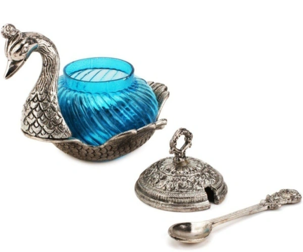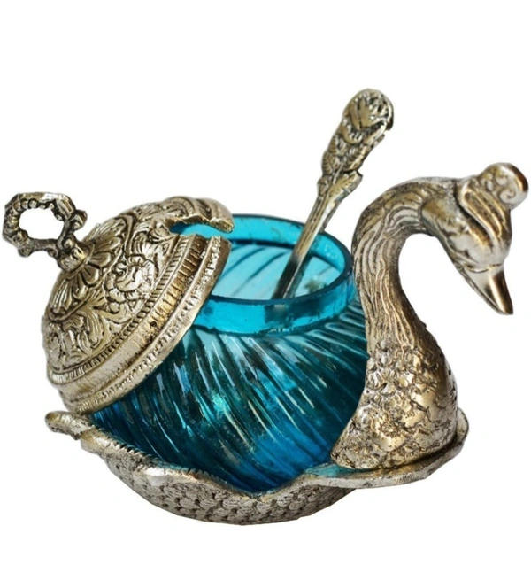 MirgIndia Duck Shape Blue Colored GlassElegant Handcrafted Single Duck Shaped Bowl with Lid Aluminium, Glass Serving Bowl (Gold, Blue, Pack of 1) About this item :- Product contains: 1 Peacock Shaped Glass bowl with one spoon and Lid Product Dimension: Length: 11.5 cm. Height: 11.5 cm. Width: 11.5 cm. , Colour: multi Table Décor Handicrafts suf supari bowl for table duck bowl metal Very Appealing And Eye Catching As A Home Decor Item USE : This Decorative Murti can be used as Interior Decoration Accessories / Table Decor Items or Showcase Decoration.Use full in serving : Sweet, Namkeen, Mouth Freshener, Dry fruits, gravy , pickle, Sugar, Tea A PERFECT GIFT : It is a Best Gift for Marriage Anniversary , Parents , Mothers day , Wedding Return Gift , Birthday , House warming , Office / Shop Inaugration , Festive occasions - Like Diwali ,Raksha Bandhan , Grah pravesh and Corporate Gifts Don't Wash, Use Dry Cotton Cloth To Remove Dirt Instruction: If you want the silver finishing instead of Little bit black then you can use colgate powder. *Thanks for connecting (Mirgindia)* Thanks so much. Shopping with Mirgindia karolbagh Delhi. *Note - China के मॉल में किसी भी प्रकार की कोई गारंटी / वारंटी नहीं होती ( चले तो चांद तक ना चले तो शाम तक )* *Only Wholesale | Good Quality Product & Long Life* *Sorry For in our Policy 🙏 | No Guarantee | No Warranty | No Return | No Refund | No Exchange 💱 |* *।। धन्यवाद ।।*