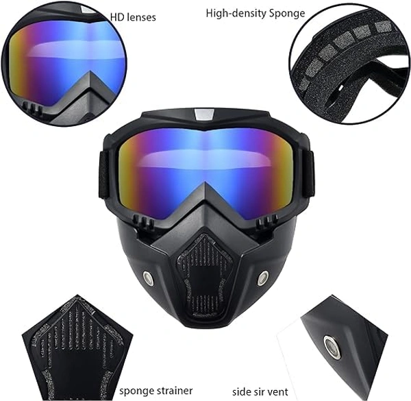 MirgIndia Face Mask Helmet Motorcycle Goggle mask Anti Scratch UV Protective Face Mask, Impact & Wind Resistant Cycling Mask, Adjustable Elastic Strap Goggles Mask for Helmet - Rainbow Visor (Pack of 1) About this item :- Frame Material: TPU super toughness, any kneading, not easy to break, soft and lightweight. Lens material: Polycarbonate, effective wear-resistant, anti-scratch, excellent all-weather anti-ultraviolet performance, blocking the damage of light to the eyes and preventing wind and dust. Sponge: High-density comfort sponge that effectively cushions facial pressure, with padding on the outer edge to keep your face comfortable and safe. Removable goggle mask :Detachable masks and goggles are used separately to match your other helmets and masks. Breathable :The breathable mouth filter and holes have good airflow avoid direct contact between mouth and mask,effectively exclude the hazardous material. Ajustable non-slip strap:cotton high elastic band, which can freely adjust the length. The non-slip strap fits any size of head, providing a comfortable wearing experience and well protection. MULTI-PURPOSE: Suitable for outdoor sports such as cycling, motorcycle, horse riding, snowmobiling, skiing, rock climbing, airsoft, paintball, jungle CF games, etc. It is a great gift for friends or family. *Thanks for connecting (Mirgindia)* Thanks so much. Shopping with Mirgindia karolbagh Delhi. *Note - China के मॉल में किसी भी प्रकार की कोई गारंटी / वारंटी नहीं होती ( चले तो चांद तक ना चले तो शाम तक )* *Only Wholesale | Good Quality Product & Long Life* *Sorry For in our Policy 🙏 | No Guarantee | No Warranty | No Return | No Refund | No Exchange 💱 |* *।। धन्यवाद ।।*