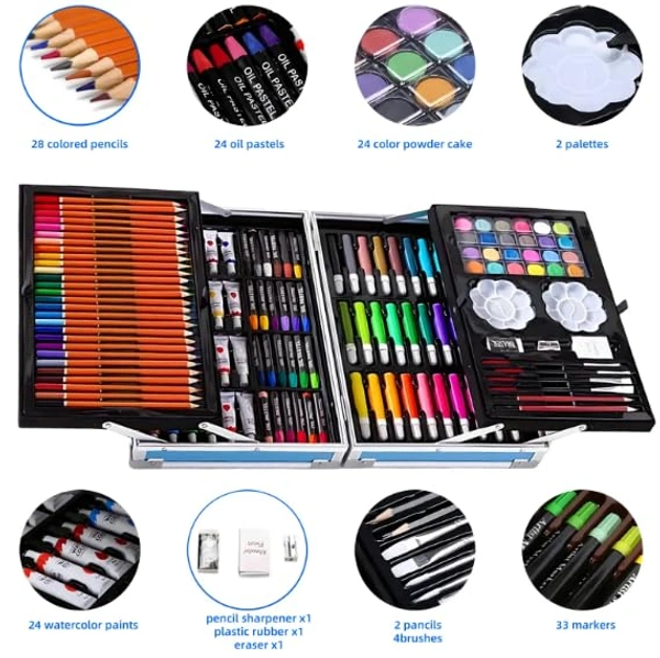 MirgIndia Kids Color kit 145pc Art Drawing Set with Unicorn Theme Storage Case, Art and Craft Supplies Kit for Drawing and Painting Art and Craft Supplies Kit with Oil Pastel, Water Color, Color Pencils, Sketch Pen ( 1 Pc Pack ) About this item:- 🎨 Deluxe Aluminium Art Case By CrazyMart:- Complete drawing set of 145 piece contains enough painting tools and colourful brushes. The art set has more than 4 kinds of painting supplies, such as crayons, watercolour pens, paints, colour pencils, palettes and other accessories. Art kits will open the door to our dream of artistic creation. With professional art set, when we have painting inspiration, we can start to create at any time. Add more colour and attraction to your creation. 🦄 Premium Quality Art Kits: Painting sets for children are made of high quality materials. Whether it is crayons or drawing coloured pencils set, the colour is vivid, the saturated colours. Art set for kids 6-12 is a washing and gentle environmental protection formula. Art set is harmless to the child and will not stimulate the child's skin. Artist pencil set for children, helps to inspire their creativity and hands on ability in painting. Art set for adults are easy to carry and safe to use. Convenient & Durable Art Supplies Suitcase: Deluxe art set come in a sturdy aluminum protective case with sturdy metal clips and handles to keep things safe on the go! This professional art set aluminum suitcase is easy to carry, looks really impressive, and the colors are great. This deluxe mega aluminum box is designed to be foldable, which can easily display some art paint set when opened, and the armrest can be extended upward to facilitate the storage of more kids art supplies. EASY TO CARRYING: drawing art kit equipped with Sturdy handle,portable and easy to carry.Make it easy for your child to color and create anywhere you can open your case! Great for Outdoor use, traveling, camping, trip. ♥ Deluxe Painting Aluminum Box Art Set Widely Use: High quality art sets for children are scientifically matched, the saturated colours, vivid and colourful. Our kids colouring pen sets are ideal for drawing, printing, sketches, shading, making albums, highlighting, writing, doodling, layering, mixing, stippling, paper, walls, crafts, blackboard, clothes, colouring books for adults, large colouring books for children, drawing for beginners, crafts for teenagers, sketch book set. ♥ Ideal For Gifts & Purchase Without Risk: Art Kits suitable for any important days, Christmas, New Year, Children's Day, Thanksgiving, Halloween, Easter, Party, Birthday, etc; Suitable for all groups: beginners, artists, children, painters, teens, adults, teachers, boys, girls, students, etc. If you encounter any problems when using art kits for kids, please contact us as soon as possible. We will provide you with satisfactory solutions. 🎁 GREAT GIFT FOR KIDS - This kids drawing set includes all types of coloring and drawing materials for artists of all ages, especially for children and beginners. Teach your kids the how to count, write and draw the fun way, inspire creativity and encourage self-expression with art supplies for coloring, drawing and crafting. A great gift for toddlers and kids for the holiday season, Christmas, kids birthdays and parties. Popular accessory in classrooms, kindergartens and day cares. *Thanks for connecting (Mirgindia)* Thanks so much. Shopping with Mirgindia karolbagh Delhi. *Note - China के मॉल में किसी भी प्रकार की कोई गारंटी / वारंटी नहीं होती ( चले तो चांद तक ना चले तो शाम तक )* *Only Wholesale | Good Quality Product & Long Life* *Sorry For in our Policy 🙏 | No Guarantee | No Warranty | No Return | No Refund | No Exchange 💱 |* *।। धन्यवाद ।।*