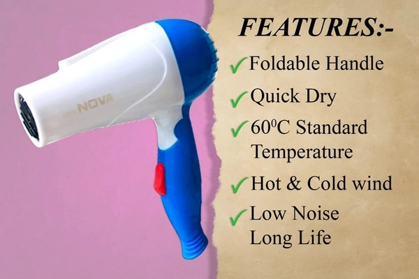 MirgIndia New Nova NV -1290 Foldable Hair Dryer Professional Electric Foldable Hair Dryer With 2 heat Setting Mini Hair Dryer for Men & Women with 2 Heat/Speed Settings and Tourmaline Technology (1000 WATT, Multicolor)_AB About this item :- Wash and condition the hair, then gently towel dry hair to remove excess water. Cool shot, Foldable handle & Cool Shot Professional Finger Diffuser GET A SALON-GRADE BLOWOUT - Your hair is unique, so whether you have long, thick, curly or coarse locks, with our hair dryer, you can master the art of salon hair styling at home. With 2 heat settings and 2 wind settings of high and low, you have the freedom to style the way you want. Use the high heat for medium thick or coarse hair, and the low heat setting for thin or damaged hair The evolutionary Infra-Ceramic Blow Dryer, combined with our patented honeycomb-shaped heating element and twin deep-penetrating infrared light technology, distributes heat evenly into hair and scalp with therapeutically effects, resulting in repair of damaged and processed hair and also preventing hair loss in early stages. Entering the new phase of infrared technology, the Infra-Ceramic Dryer is equipped with a honeycomb shaped ceramic, coated in a patented silver coating solution, which enables to focus gentle heat and air velocity while dissolving. *Thanks for connecting (Mirgindia)* Thanks so much. Shopping with Mirgindia karolbagh Delhi. *Note - China के मॉल में किसी भी प्रकार की कोई गारंटी / वारंटी नहीं होती ( चले तो चांद तक ना चले तो शाम तक )* *Only Wholesale* *Good Quality Product & Long Life* *Sorry For in our Policy 🙏 | No Guarantee | No Warranty | No Return | No Refund | No Exchange 💱 |* *।। धन्यवाद ।।* 10418