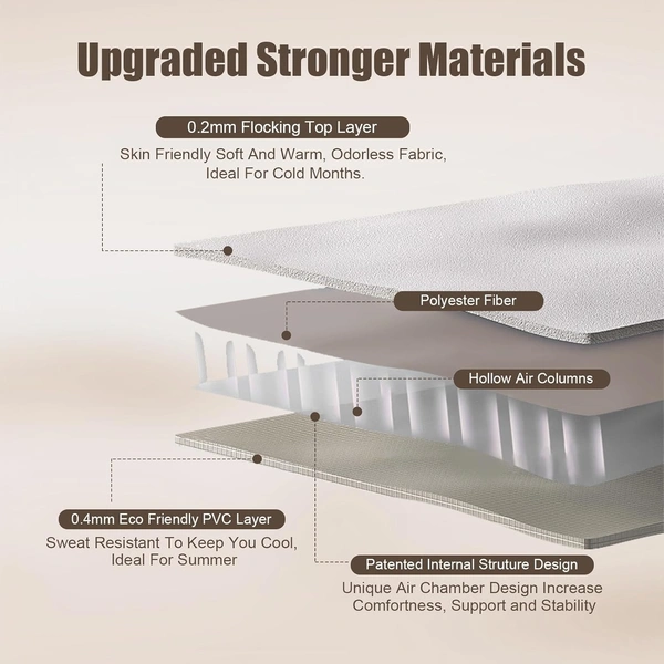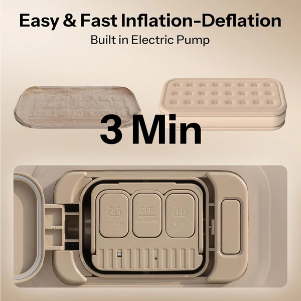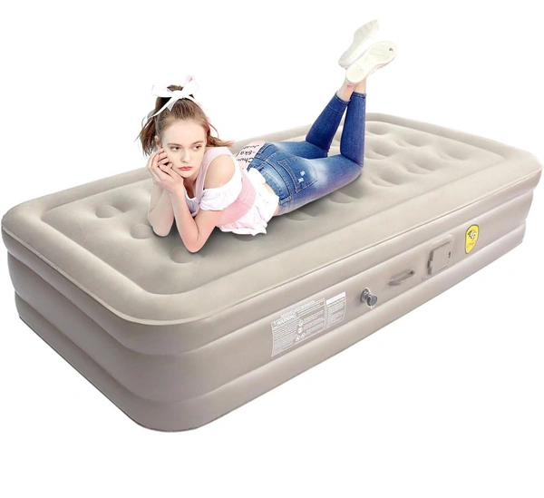 MirgIndia Single Air Bed Mattress With Built-in Pump Single Air Bed,Inflatable Bed with Built-in Electric Pump,3 Mins Quick Self-Inflation/Deflation Guest Air Mattress,Blow Up Bed for Home Portable Camping Travel,Beige About this item :- Upgraded Stable Twin Air Mattress: The 21 advanced air coil beam construction evenly distributes weight, with a maximum load capacity of 650 pounds. Exclusive and Innovative Four Chamber structure, makes the whole colchon inflables twin superbly supportive and comfortable. Providing firm full-body support for guests or family have an excellent temporary night's rest Self Inflating Blow-up Mattress: The built-in High-Powered electric air pump, one-click allows for quick and easy inflation and deflation in 2 minutes. Reduce air leakage and the time for inflation and deflation, making twin air mattress built in pump more convenient and efficient to use Built For Luxury Comfort: Twin air bed has multi layer soft top flocking. High-grade flocking fabric is soft on the skin and breathable. It's non-irritating, gentle on the skin, properties to cater to all sleepers. This inflatable mattress twin guarantees a restful night's sleep wherever you go Durability PVC Design: Double layer construction with puncture-resistant PVC material greater tensile strength than others for a distortion-free air mattress, the bottom of blow up mattress twin is equipped with grippy PVC material which can provide good anti slip stability. Material is easy to clean after use, simply wipe down with a damp cloth SPECIFICATIONS: Measures 191 cm x 99 cm x 46 cm when fully inflated, supports up to 135 kg, beige colour Inflatable Mattress: Twin size air mattress comes with a carrying bag for convenient to store and carry on-the-go. Whether colchones inflables is for overnight guests or friends, watching a home theater in the living room, taking a break in the yard, travel or camping trips, anywhere bed meets your high-quality requirements anytime, anywhere *Thanks for connecting (Mirgindia)* Thanks so much. Shopping with Mirgindia karolbagh Delhi. *Note - China के मॉल में किसी भी प्रकार की कोई गारंटी / वारंटी नहीं होती ( चले तो चांद तक ना चले तो शाम तक )* *Only Wholesale* *Good Quality Product & Long Life* *Sorry For in our Policy 🙏 | No Guarantee | No Warranty | No Return | No Refund | No Exchange 💱 |* *।। धन्यवाद ।।* 10312