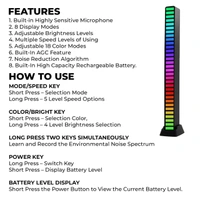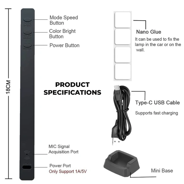 MirgIndia Sound Control Light Wireless Plastic 32-Bit RGB Rhythm Light Bar Sound Control Voice Activated Pickup Light Bar for Desktop Table Gaming Room Car Tv Dj and Home Rechargeable Black ( 1 Pc. Pack ) About this item :- Package Include: 1x LED RGB Music Level Light, USB Cable, Light Base, User Manual Sound Control Light With AGC Automatic Gain Control: Built-in high sensitive microphone (voice control), no less than 8 display modes. 4 levels of brightness, 5 levels of speed and 18 color modes can be adjusted at will, Whether you are a musician, a video game player, audiophile etc, imagine this Music level light dancing with the rhythm. you can tune it to your favorite style according to your preference. With intelligent noise-canceling algorithm, it can be used in noisy environment. Voice Activated Atmosphere Light with High-sensitivity Pickup MIC: Sound Control Music Rhythm Lamp built-in high-sensitivity pickup MIC, the complex rhythm can also keep up with the automatic display of the light block according to the rhythm. And Sound Activated Colorful Music Lamp with 32 light beads built-in 300mAh, can also be used outdoors, can be powered by power bank, computer, power supply, etc. Widely Application for Voice Pickup Rhythm Light: The RGB audio spectrum indicator features an innovative design and a perfect combination of music and art. It is suitable for music lovers as well as electronics lovers, at the same time, it can be used as a pleasant art decoration. You can put the rhythm lights on your desk, bedside table or car to create a relaxing and exciting atmosphere which helps reduce your stress and trigger your idea. *Thanks for connecting (Mirgindia)* Thanks so much. Shopping with Mirgindia karolbagh Delhi. *Note - China के मॉल में किसी भी प्रकार की कोई गारंटी / वारंटी नहीं होती ( चले तो चांद तक ना चले तो शाम तक )* *Only Wholesale* *Good Quality Product & Long Life* *Sorry For in our Policy 🙏 | No Guarantee | No Warranty | No Return | No Refund | No Exchange 💱 |* *।। धन्यवाद ।।* 10181