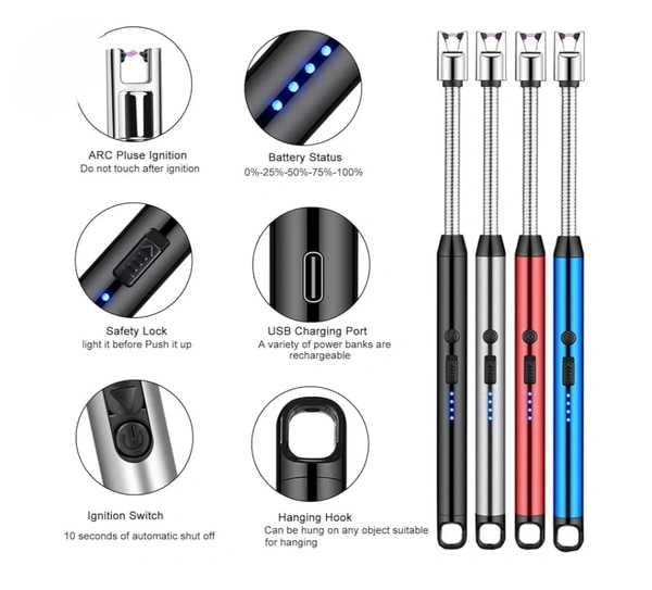 MirgInia USB Lighter with Led Battery Gas Lighter,Arc Lighter with USB Charging, Flameless Windproof, LED Battery Indicator, Safety Lock, Metal Hook, Available in Multicolour Rotate 360 Degrees for Aromatherapy, Candles, BBQ, Camping... About this item :- 【USB Charging】:The arc lighter is equipped with USB charging,type-b charging interface,arc lighter can be charged directly from the power source or using a power bank,computer,etc,candle lighter can be used more than 500 times in per charge.The electric candle lighter with LED power indicator light,it can remind you to charge in time. 【360° Adjustable】:The electric candle lighter can be bent and rotated 360 degrees,and the angle can be adjusted according to the requirements of use.The arc lighter can be used for candles,picnics,gas,fireplaces and other occasions.There is a hook at the end of the candle lighter for easy storage. 【Windproof And Flameless】:The electric lighter adopts plasma arc windproof and flameless technology,no flame,no butane, no trouble. The candle lighter is suitable for strong wind and damp environment, the electric candle lighter is an ideal lighting tool for you to use outdoors.Compared with other arc igniters,the noise is lower. 【Child Protection】:The arc lighter has a child protection function.You need to turn on the power switch before you can ignite,The candle Lighter will automatically cut off power for 8 seconds.The usb lighter with overcharge protection,overvoltage protection,and temperature protection,it can extend battery life. 【Package Includes】Product set:candle lighter*1,usb charging cable*1.If you have any problems during use,please feel free to contact us,we will solve the problem as soon as possible. *Thanks for connecting (Mirgindia)* Thanks so much. Shopping with Mirgindia karolbagh Delhi. *Note - China के मॉल में किसी भी प्रकार की कोई गारंटी / वारंटी नहीं होती ( चले तो चांद तक ना चले तो शाम तक )* *Only Wholesale | Good Quality Product & Long Life* *Sorry For in our Policy �� | No Guarantee | No Warranty | No Return | No Refund | No Exchange �� |* *।। धन्यवाद ।।* 10112