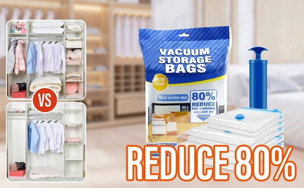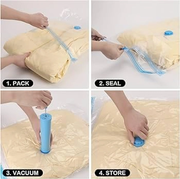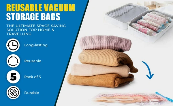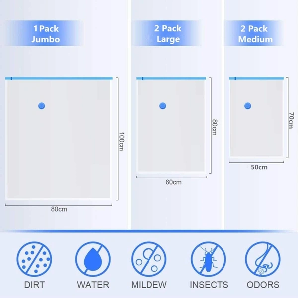 MirgIndia Vacuum Storage Bags 5-Pack Space Saver Bags for Travel & Home – Self-Compression Organizer for Blankets Vacuum Storage Bags For Clothes With Hand Pump | Vacuum Storage Bags | Pack of 5 Vaccum bags | 80% Space Saving | Bigger Thicker Bags | 3 piece heav duty...(2bags50*70cm,2bags60*80cm,1bag80*100cm)-vacuum bags for storage|vacuum bags for clothes with pump|cloth vacuum... About this item :- SPACE SAVING: Revolutionary vacuum storage system reduces original volume by up to 80%, perfect for storing clothes, bedding, and seasonal items PACKAGE CONTENTS: Set includes vaccum storage bags of size 2pc(50x70cm), 2pc(80x60cm), 1pc(80x100cm) and 1 hand pump for convenient compression without requiring an electric vacuum EASY TO USE: Simple 4-step process - pack items in bag, seal completely, remove air using included pump, and store away neatly DURABLE DESIGN: Constructed with thicker, more robust material to prevent air leakage and ensure long-lasting protection of stored items VERSATILE STORAGE: Ideal for blankets, pillows, duvets, winter clothes, and other bulky items, helping maximize closet and storage space 3 Heavy duty self adhesive wall Hooks included with pack for home and kitchen use Thanks for connecting (Mirgindia) Thanks so much. Shopping with Mirgindia karolbagh Delhi. Note - China के मॉल में किसी भी प्रकार की कोई गारंटी / वारंटी नहीं होती ( चले तो चांद तक ना चले तो शाम तक ) Only Wholesale | Good Quality Product & Long Life Sorry For in our Policy 🙏 | No Guarantee | No Warranty | No Return | No Refund | No Exchange 💱 | ।। धन्यवाद ।। 10286